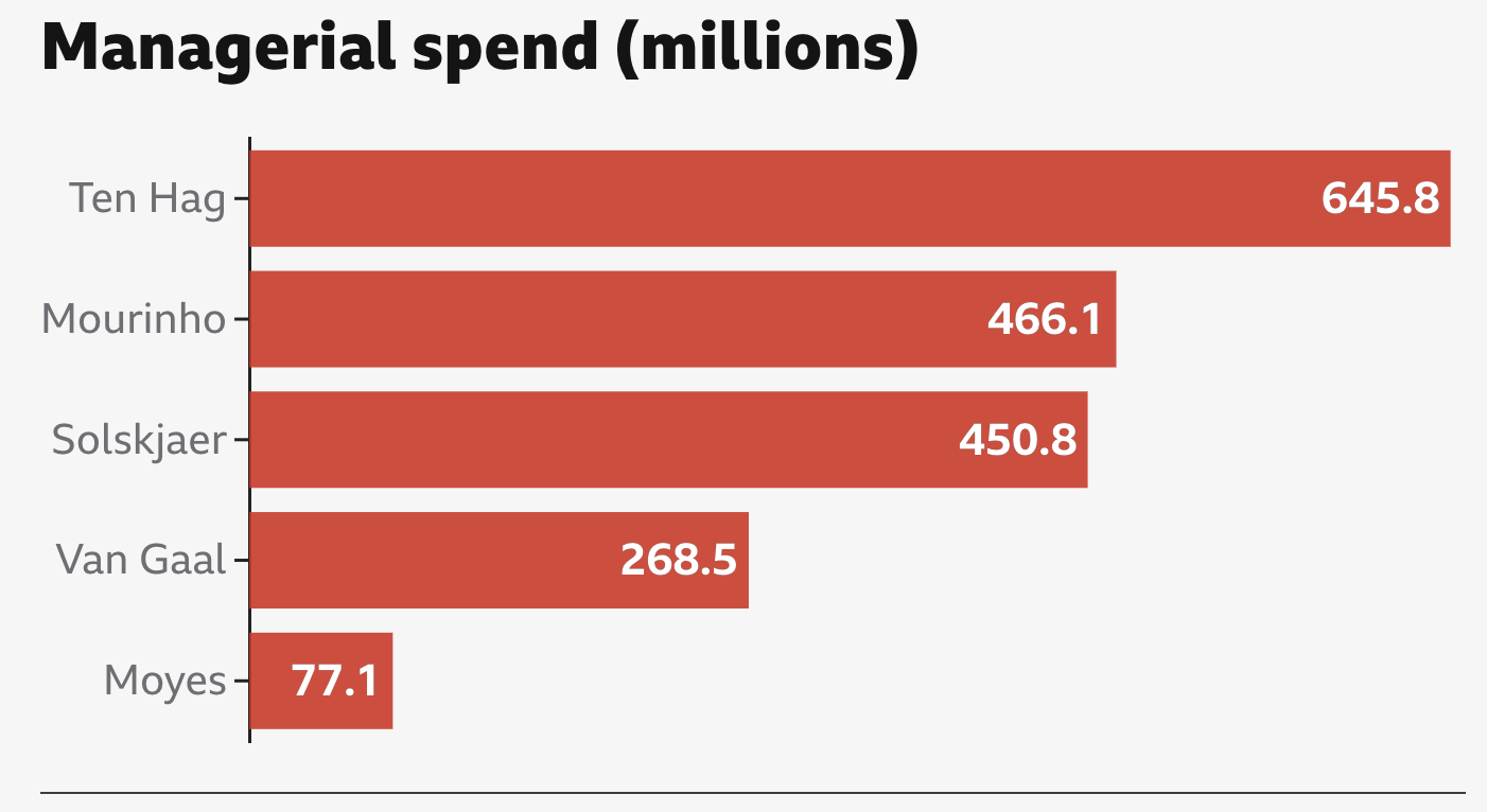 텐하흐 감독은 퍼거슨 이후 맨유의 지휘봉을 잡은 감독들 중 가장 많은 이적료 지출을 기록하고 있다.